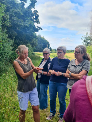Entlang des Weges zeigte sie uns, welche Wildkräuter und Pflanzen essbar sind, welche heilende Wirkung sie haben können und wie man sie vielseitig verwenden kann-ob als Tee, Salbe oder in der Küche. Bislang waren diese Pflanzen bei uns Landfrauen als Unkraut abgespeichert. Zum Glück bekamen nun Brennnessel, Spitzwegerich und Weide einen neue Bedeutung. Ein: " oh, das wusste ich nicht. " oder " wirklich, das kann das?" konnten wir oft hören. Die Erklärungen waren somit nicht nur lehrreich, sondern auch sehr anschaulich und praxisnah.